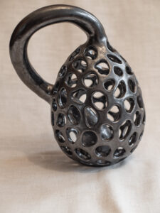 Die Liebe zu Natur und Garten spiegelt sich in den Keramiken wider. Figuren, Stelen, Kugeln, ausgefallene Pflanzen-Töpfe finden auch gerne ihren Platz im Garten. Ebenso holen die Skulpturen von Tieren und Früchten die Natur in den Wohnbereich. Die Beschäftigung mit geometrischen Formen wie Sphericon, Möbiusband, Klein´sche Flasche und Oloid ist ein weiteres Faible, das ein Arbeiten mit hoher Präzision erfordert.